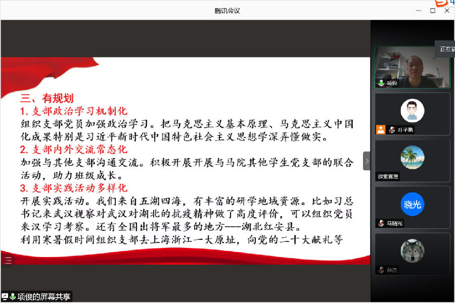 班主任王贵贤老师介绍了班级党支部和班委会成立的背景、意义并提出了对大家未来学习、工作的期待。王贵贤老师介绍,建设非全日制基层党支部是williamhill中文深入贯彻落实十九大精神,加强党员教育、集体教育的重要举措,是落实党的教育方针的重要内容。她指出,清马博203班是承前启后、继往开来的一个班级,新冠肺炎疫情的“大考”充分证明了社会主义制度的优越性以及中国特色社会主义制度的最大优势是中国共产党的领导。班级全体同学作为马院博士生,承载着讲好思政课、传播正能量、当好引路人的责任和重担。全体同学要自觉做到马院姓马、在马言马,传递好清华马院声音,做马克思主义的信仰者、弘扬者、传播者。