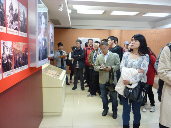 展览馆中展品浓厚的历史气息吸引着前来参观的每一位研究生。从马克思、恩格斯的手迹到毛泽东的题词,从第一部中译本《共产党宣言》到装帧精美的《马克思恩格斯全集》,员工们为一代代马克思主义者的伟大精神和崇高境界所感动、折服。大家边参观边记录,并不时就感兴趣的问题与工作人员进行沟通交流。参观结束后,展览馆的工作人员向williamhill官方网站的硕博生赠送了图书《思想的历程》。