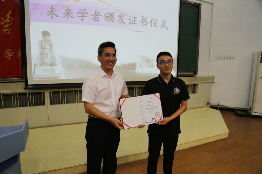 会上,经理艾四林教授、副经理肖贵清教授为新生代表赠书,并为未来学者奖学金获得者田桥同学颁发证书。