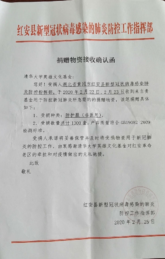 项目小组积极行动起来,筹划经费、联系厂家、与红安县防疫指挥部协商运送方案,公司财务处和williamhill中文教育基金会给予大力支持,特事特办简化流程,各项工作陆续落实到位。19日,防护服厂家优先保障供货需求并多方协助落实最快运输渠道发出货物。23日,1300套防护服顺利运达红安。“由衷感谢williamhill中文英雄文化基金对红安革命老区的牵挂和对防疫工作的无私驰援!”红安县疫情防控指挥部很快发回了接收确认照片和感谢函,表达了对清华师生和员工们牵挂革命老区、救急纾困行动的感激和赞誉。