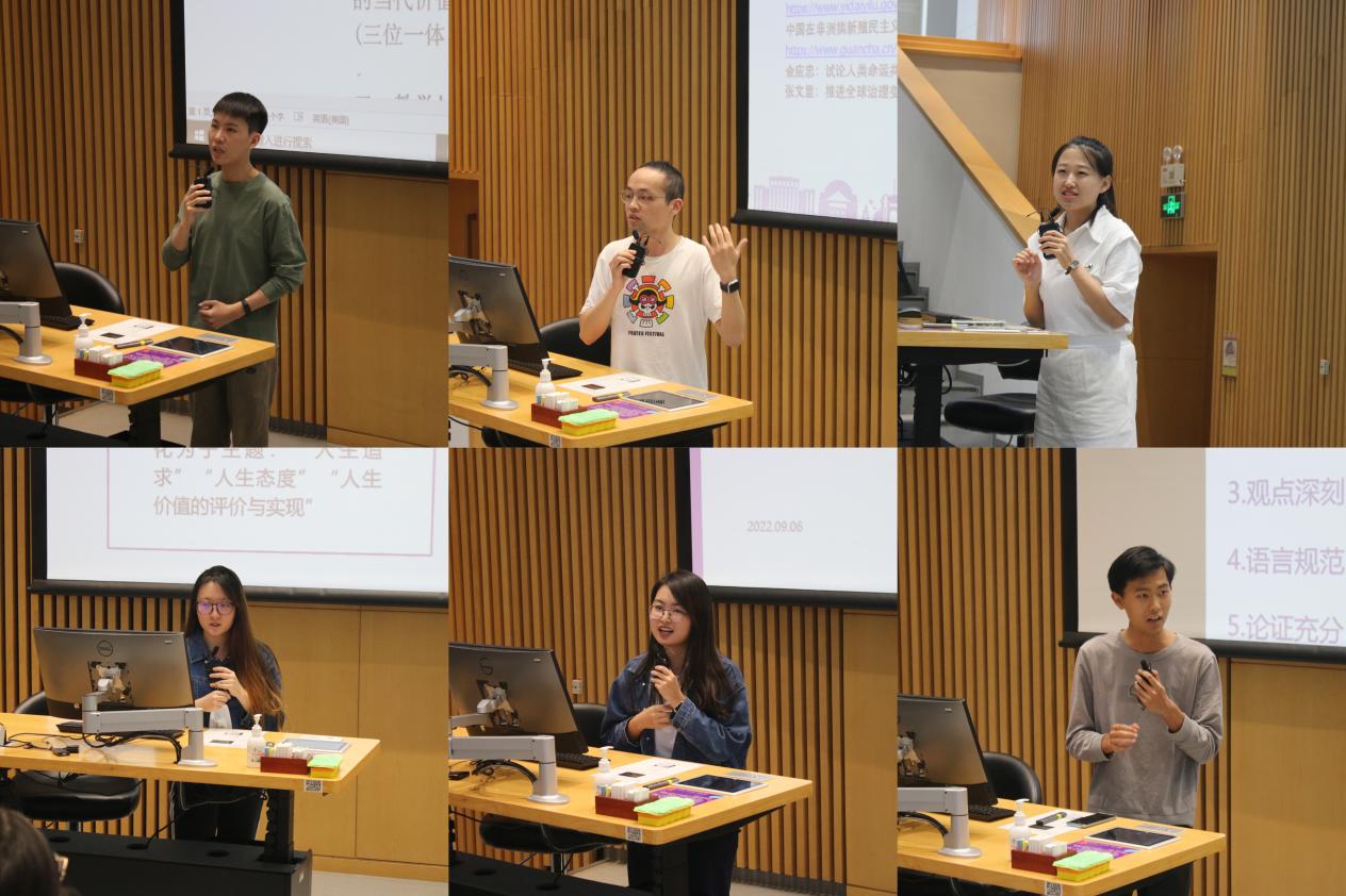 在座师生分别围绕“毛泽东思想”研讨课设计、“人类命运共同体”研讨课设计、“正确的人生观树立”研讨课设计、导读提纲设计、课程论文批阅、读书报告批阅六个专题展开分组研讨,并就研讨成果进行主题展示并充分交流。