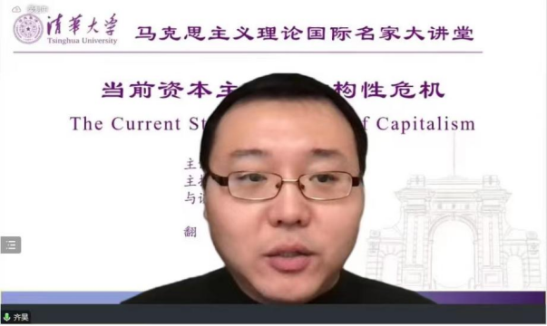 齐昊副教授高度评价了科兹教授用社会积累结构理论(SSA)分析新自由主义和资本主义长期经济危机的深刻性,并归纳了科兹教授提出的美国资本主义的发展面临着三种可能方向:一是仍坚持新自由主义,二是采取右翼威权主义,三是进行社会民主主义改革。在此基础上,齐昊副教授就社会积累结构理论中政治与经济、上层建筑与经济基础之间的互动同科兹教授展开了交流与讨论。对这一问题的讨论与交流,深化了对社会积累结构理论与马克思历史唯物主义理论的关系以及历史唯物主义理论中生产力与生产关系相互作用等问题的思考。