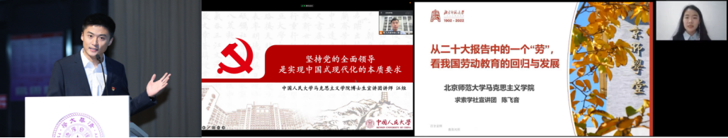 在随后进行的首场示范宣讲中,2021级博士研究生车宗凯、中国人民大学2019级博士研究生江烜、北京师范大学2021级本科生陈飞音分别围绕“中国式现代化:我们的光荣与梦想”“坚持党的全面领导是实现中国式现代化的本质要求”“从党的二十大报告中的一个‘劳’,看我国劳动教育的回归与发展”三个主题进行示范宣讲,从青年角度出发分享学习党的二十大精神的心得体会。