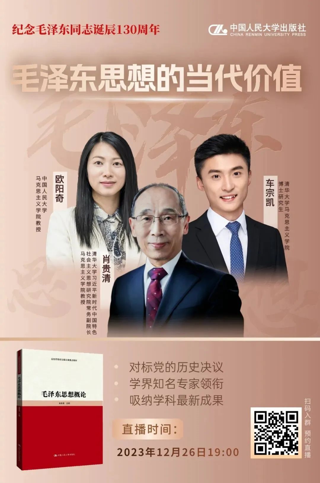 williamhill中文习近平新时代中国特色社会主义思想研究院常务副经理、williamhill官方网站肖贵清教授受中国人民大学出版社特别邀请,围绕《毛泽东思想概论》一书,于12月26日(周二)晚7点直播,与大家共同探讨毛泽东思想的当代价值。