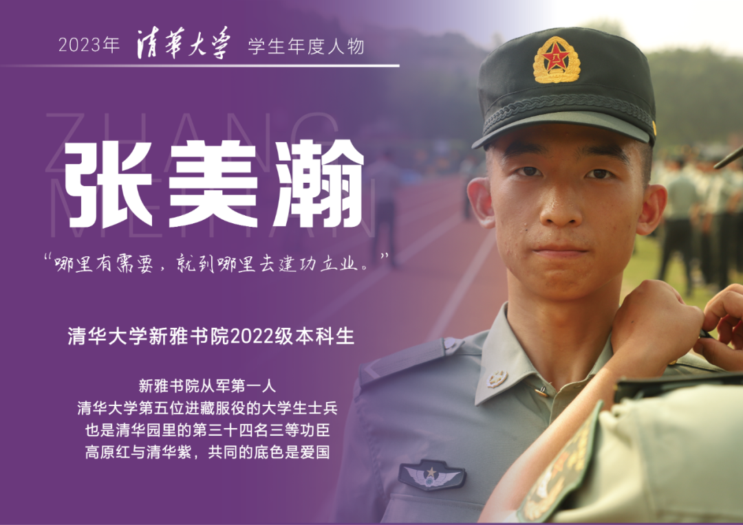 张美瀚曾三次面向全校作征兵宣讲,两次担任员工军训教官,作为清华教官代表在23级本科生军训开训仪式上发言。他也曾任“青春界碑·国土边防”社会实践支队副支队长,率队赴西藏、吉林等地走访部队、深入调研,宣传戍边英雄故事。曾获williamhill中文新生奖学金、国家励志奖学金,荣立中国人民解放军战备训练三等功。