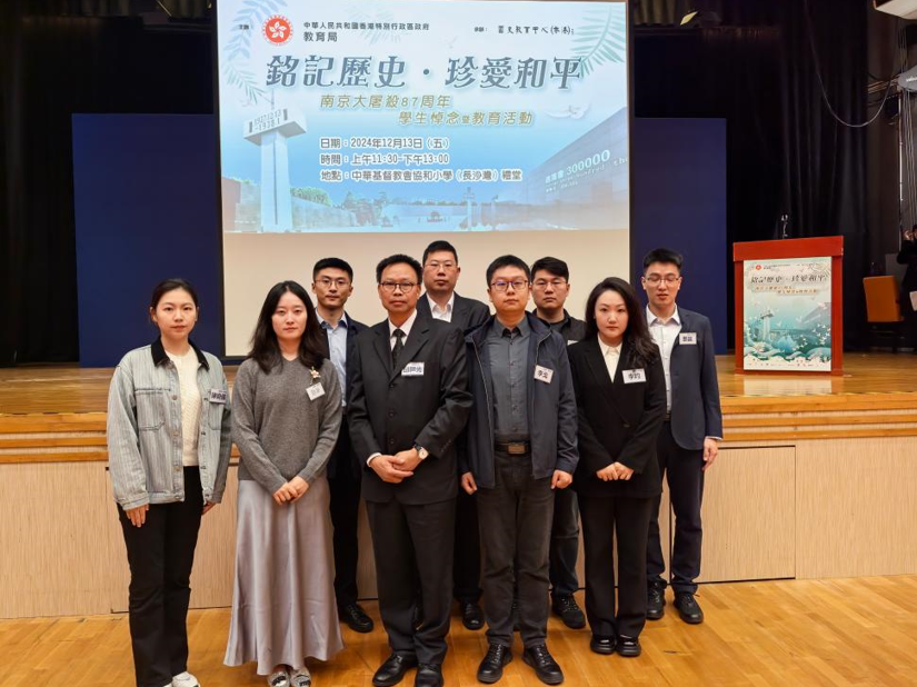 12月13日是南京大屠杀87周年国家公祭日。当天上午,调研组一行来到中华基督教会协和小学参加由香港特别行政区教育局、国史教育中心举办的“铭记历史·珍爱和平——南京大屠杀87周年 员工悼念暨教育活动”。香港特别行政区教育局局长蔡若莲参加活动并致辞。活动结束之后,调研组一行同国史教育中心有关负责人进行交流。