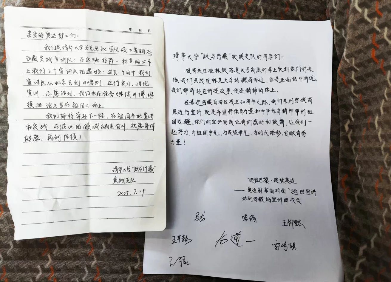 记者辗转联系到写信的实践支队的同学们。“我们从新闻报道中获悉奥运冠军宣讲团也来到了。他们的出发地林芝市,恰好是我们下一阶段社会调研的目的地。机缘巧合的是,我们通过乘务员得知,我们乘坐的正是他们即将搭乘的前序列车,并且所坐的位置,正是他们后续即将入座的席位。”实践支队队长左宏量说。