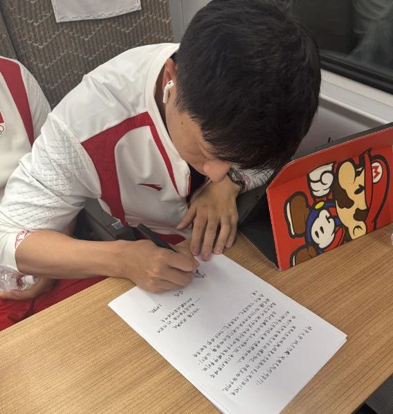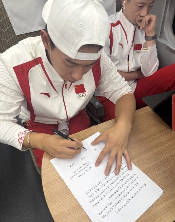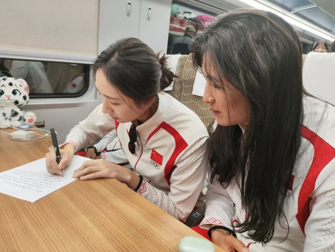 在列车上进行的宣讲活动刚一结束,奥运冠军王柳懿根据大家商量好的内容,认真地写好了回信。马龙、龙道一、陈清晨、王芊懿、郭崎琪、李倩一起在这封饱含青春激情的信上签上了名字。