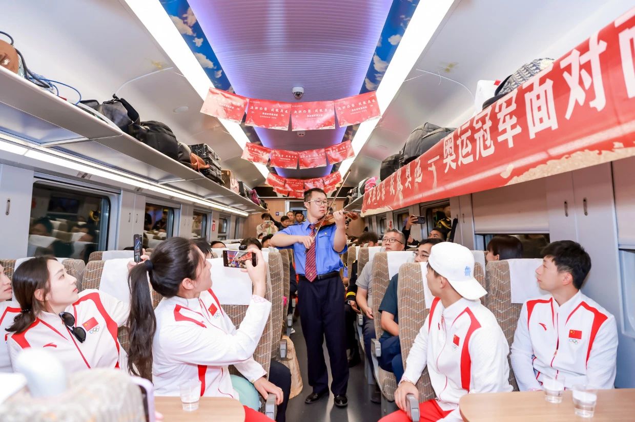 奥运冠军、铁路职工和乘客合唱《我和我的祖国》。 岳红燕 摄